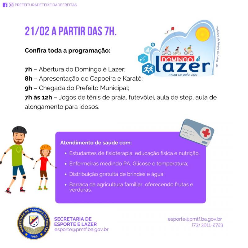 Ideal para toda a família e os amantes de esportes ao ar livre, o “Domingo é Lazer” retorna às suas atividades no próximos Domingo (21). As novidades são muitas, desde aulão de Step e Alongamento até barracas da saúde e agricultura familiar. A Avenida Getúlio Vargas estará fechada a partir das 7h para a prática de esportes ao ar livre.