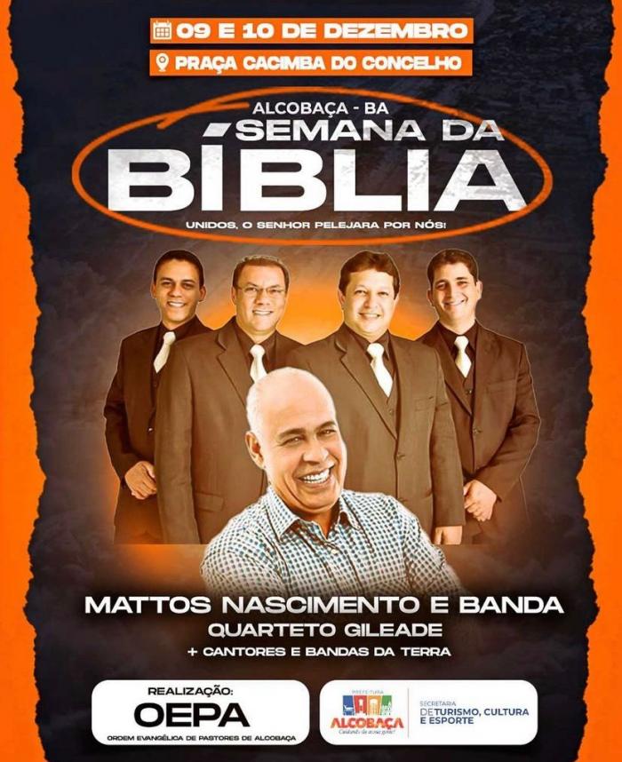 O município de Alcobaça se prepara para a ”Semana da Bíblia”, o evento realizado pela Ordem Evangélica de Pastores de Alcobaça com apoio da Prefeitura Municipal por meio da Secretaria de Turismo, Cultura e Esporte trará shows com grandes nomes da música gospel sendo eles; Mattos Nascimento e banda Quarteto Gileade além de cantores da cidade.