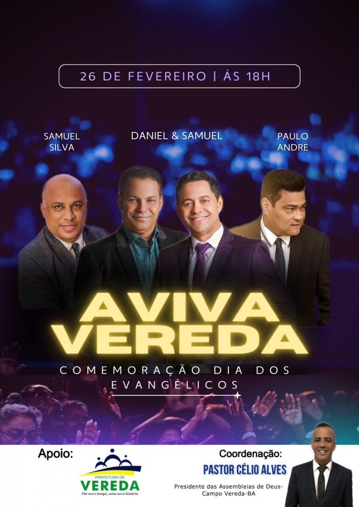 O dia 26 de fevereiro é dia do evangélico em Vereda, e a comemoração esse ano promete entrar pra história, com a presença de Samuel Silva, o cantor e repentista evangélico Paulo André e a dupla sertaneja evangélica de maior sucesso no Brasil, que é Daniel e Samuel.