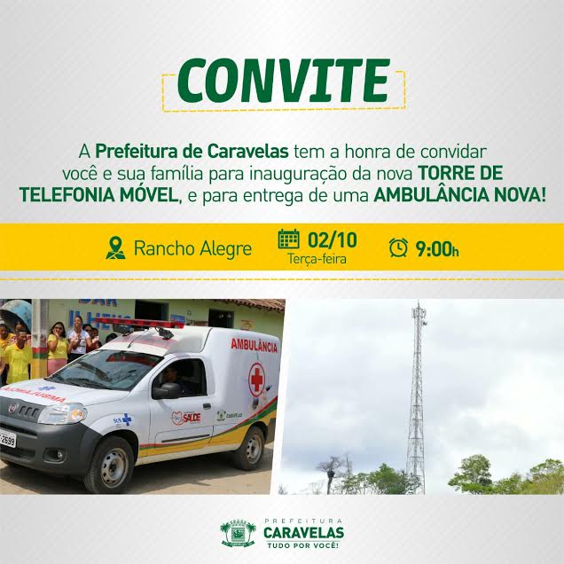 Na próxima terça-feira, 2 de outubro, a Prefeitura de Caravelas realizará a entrega de uma ambulância nova e inaugurar a torre de telefonia móvel aos moradores de Rancho Alegre.