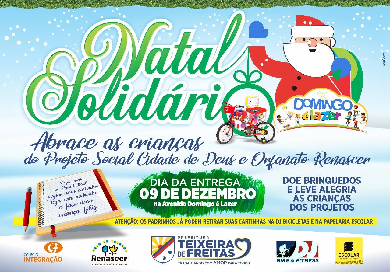 Neste domingo, 09 de dezembro, a Prefeitura Municipal de Teixeira de Freitas (PMTF), através do programa Domingo é Lazer, convida toda a população para participar do Natal Solidário.