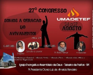 A Umadetef (União de Mocidade das Assembleias de Deus de Teixeira de Freitas), realizará entre os dias 24 a 27 de agosto, seu 27º congresso, numa festa que pretende reunir milhares de fiéis e mais de mil jovens para louvar a Deus, a festa acontecerá no templo central da Assembleia de Deus, que fica situado na Rua Eleuzibio Cunha 928, no Bela Vista.