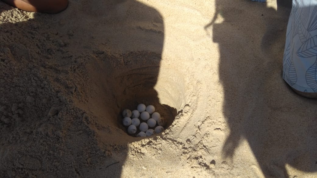 A secretária explicou que logo depois da postura, a mãe volta para o mar. É o calor da areia que desenvolve os embriões no interior dos ovos. Geralmente, as fêmeas escolhem praias mais desertas para fazerem o ninho. A única possibilidade das fêmeas para proteger os filhotes é a camuflagem do ninho.