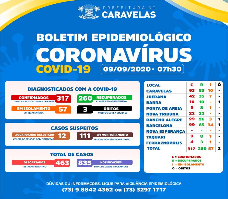 A prefeitura de Caravelas através da Secretaria de Saúde confirmou às 07h30 da quarta-feira, 9 de setembro, em relação ao boletim anterior, 1 novo caso confirmado e 3 morte