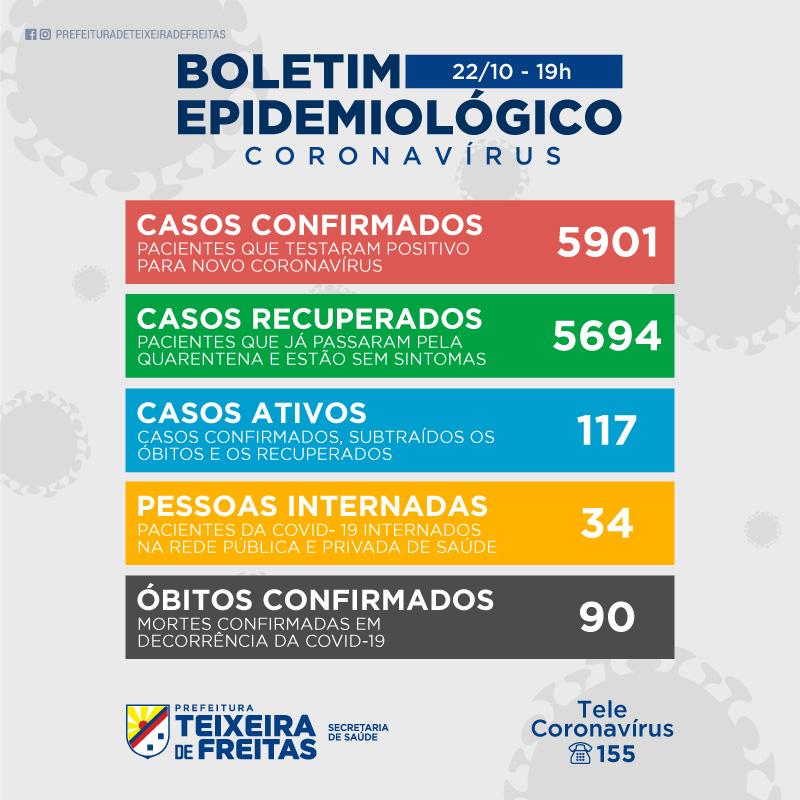 Na quinta-feira, 22 de outubro, a Secretaria de Saúde de Teixeira de Freitas informou que houve registro de 45 novos casos positivados. Ao todo, são 5901. Destes, 117 são considerados ativos.