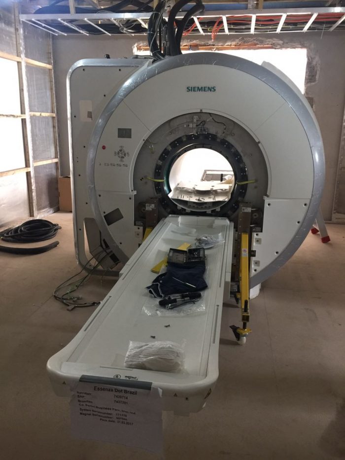 Todos os equipamentos da Policlínica são de última geração supermodernos e já chegaram todos e estão na fase final de montagem como é o caso do aparelho de ressonância magnética abaixo, que leva cerca de 45 dias para ser montado e colocar em funcionamento, porém já está na fase final de instalação para realização dos testes.
