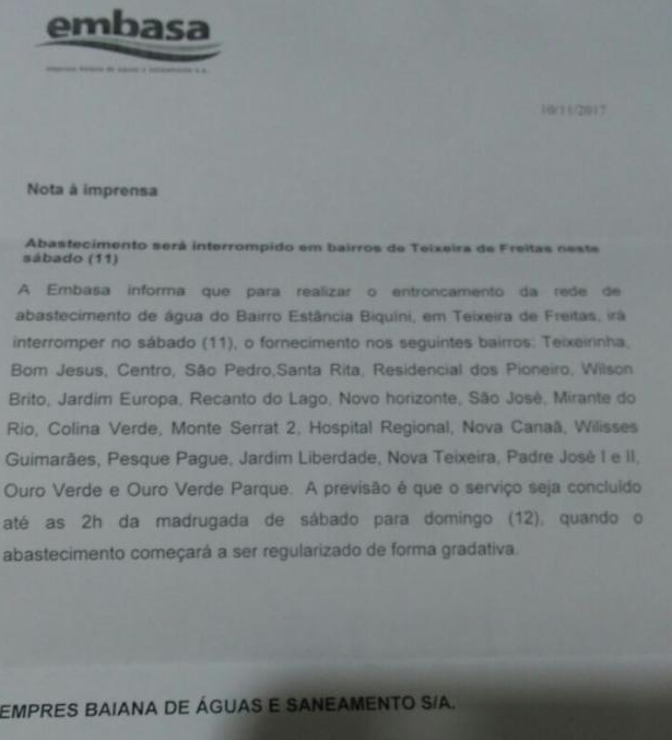 A Embasa informa que para realizar o entroncamento da rede de abastecimento de água do Bairro Estância Biquíni, em Teixeira de Freitas, irá interromper no sábado (11), o fornecimento nos seguintes bairros: Teixeirinha, Bom Jesus, Centro, São Pedro, Santa Rita, Residencial dos Pioneiros, Wilson Brito, Jardim Europa, Recanto do Lago, Novo Horizonte, São José, Mirante do Rio, Colina Verde, Monte Serrat 2, Hospital Regional, Novo Canaã, Ulisses Guimarães, Pesque Pague, Jardim Liberdade, Nove Teixeira, Padre José I e II, Ouro Verde e Ouro Verde Parque. A previsão é que o serviços seja concluído até às 2h da madrugada de sábado para domingo (12), quando o abastecimento começará a ser regularizado de forma gradativa.
