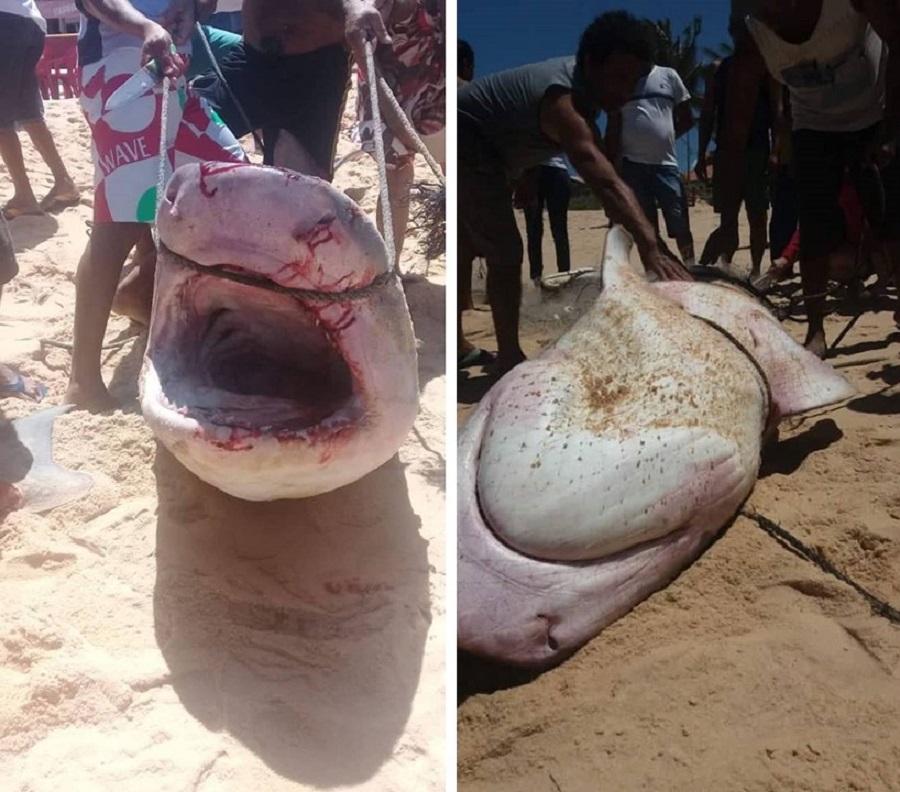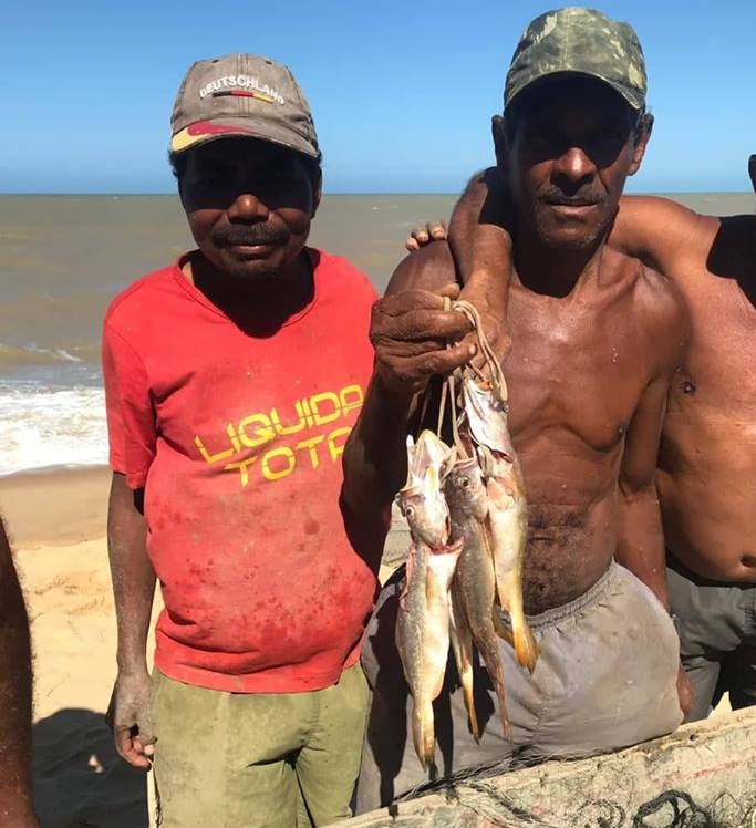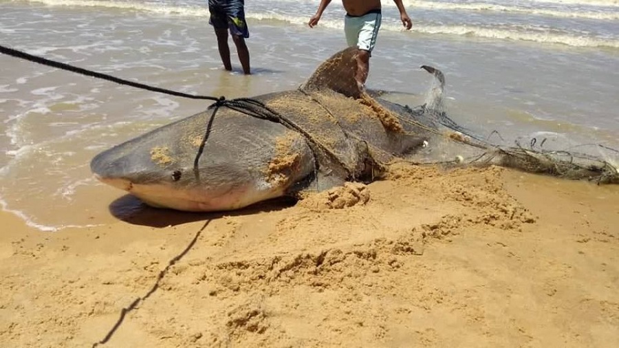 Um tubarão foi capturado pela rede de dois pescadores: Jorge da Silva (sem camisa) e Oliveira e João da Conceição, que de costume, instalam o instrumento de pesca nas proximidades da praia de Alcobaça, no extremo sul da Bahia. Por volta das 11h de terça-feira (9), foram arrastar as redes e perceberam que havia pescado o animal, que deve ser da espécie Tigre. Eles medem cerca de dois metros e chegam a pesar 200 quilos. Como essa espécie não está na lista de extinção, a captura não é considerada crime ambiental.