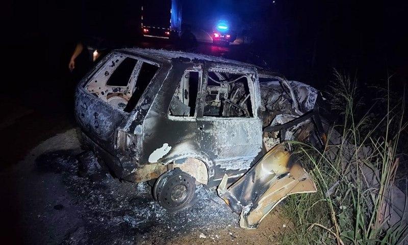 Após colisão, carro pega fogo e motorista é socorrido por caminhoneiro na BR-101