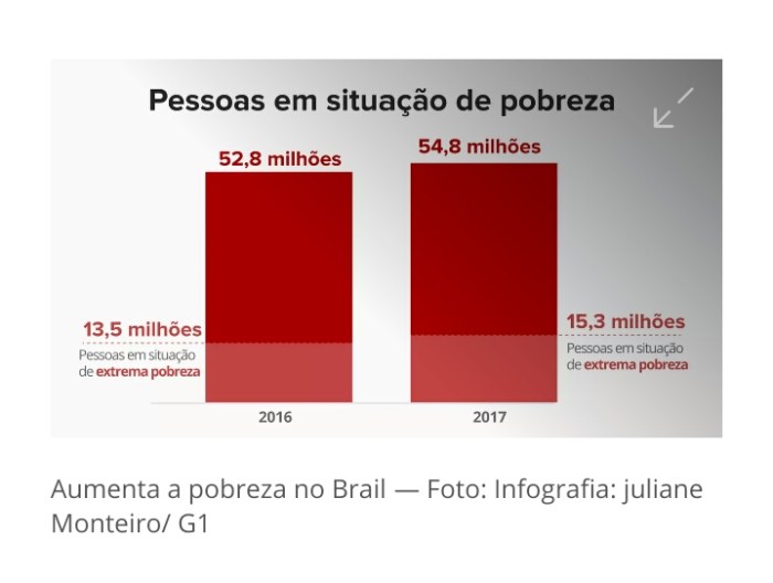 De acordo com a pesquisa, em 2016 havia no país 52,8 milhões de pessoas em situação de pobreza no país. Este contingente aumentou para 54,8 milhões em 2017, um crescimento de quase 4%, e representa 26,5% da população (em 2016, eram 25,7%).