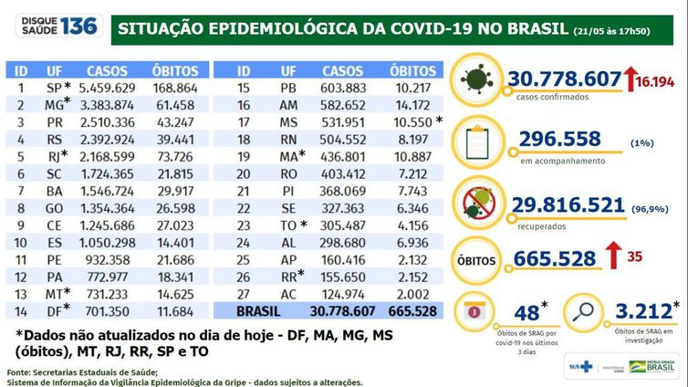 O número de mortes chegou a 665.528, com 35 registradas em 24 horas. Os pacientes recuperados somam 29.816.521 (96,9% dos casos).