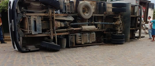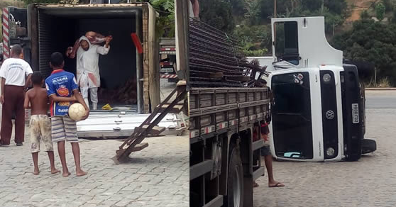 O condutor de um caminhão baú, Placa ODJ-8084 modelo VW/8.160 de cor branca e licenciada em Linhares (ES), que transportava conteúdo frigorífico, perdeu o controle e tombou ao sair da rodovia BR-101, no trevo que leva até o bairro Novo Prado.