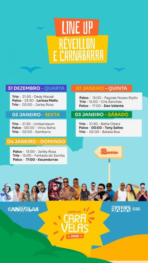 A Prefeitura de Caravelas, em parceria com o Governo do Estado da Bahia, divulgou oficialmente a programação completa do Réveillon e do Carnabarra 2026, que prometem movimentar a cidade entre os dias 31 de dezembro de 2025 e 4 de janeiro de 2026, reunindo grandes atrações musicais no palco e no trio elétrico.