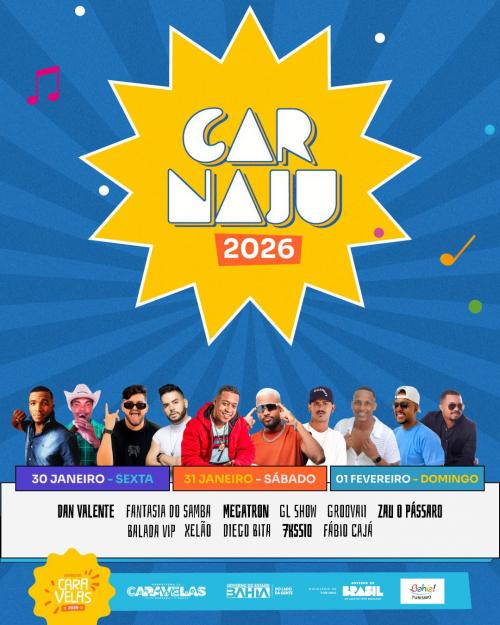 A realização do CarnaJu conta com o apoio da Prefeitura de Caravelas, do Governo do Estado da Bahia, do Ministério do Turismo e do Governo Federal, reforçando o compromisso com a valorização da cultura, do turismo e do desenvolvimento regional.