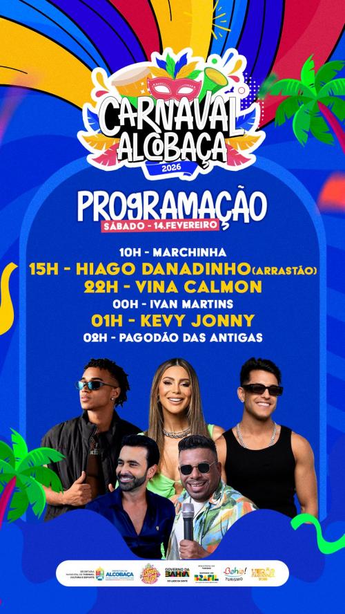 O Carnaval de Alcobaça 2026 segue com força total neste sábado, 14 de fevereiro, trazendo uma programação diversificada que promete atrair foliões de todas as idades. Com atrações que vão da tradicional marchinha ao pagodão, a festa reforça a tradição do município como um dos destinos mais animados do extremo sul da Bahia durante o período carnavalesco.