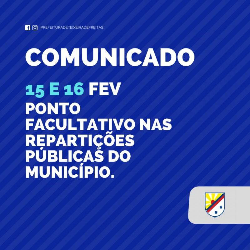 A Prefeitura de Teixeira de Freitas publicou, na última semana, no Diário Oficial do município o Decreto 332.2021, que institui ponto facultativo em repartições públicas municipais nos dias 15 e 16 de fevereiro, segunda e terça de Carnaval.