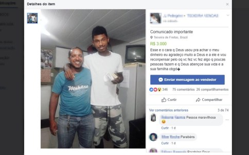 “Esse é o cara que Deus usou pra achar o meu dinheiro. Eu agradeço muito a Deus e a ele e vou recompensar pelo que você fez. Você fez algo que poucas pessoas fazem, e que Deus abençoe sua vida e a sua família”, escreveu.