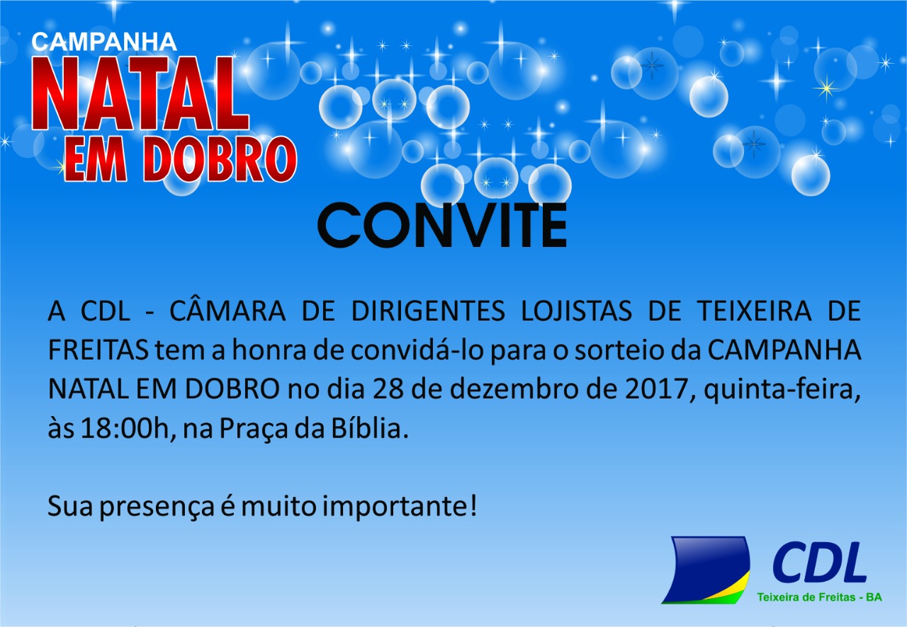A Câmara de Dirigentes Lojistas (CDL) vai realizar o sorteio da Campanha de Natal na próxima quinta-feira, 28 de dezembro, na Praça da Bíblia em Teixeira de Freitas.