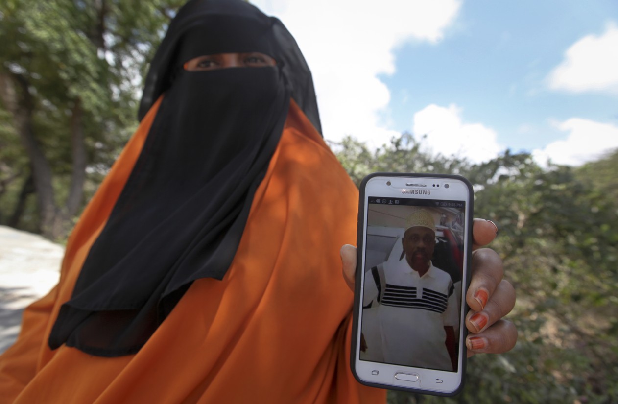 Sentada do lado de fora do hospital, Hodan Ali espera encontrar seu irmão que está desaparecido. Ela mostra às pessoas sua foto em uma tela de celular. Abdiqadir Ali, um motorista de taxi de 50 anos, foi visto pela última vez no sábado quando ia a um hotel para pegar um cliente, antes da grande explosão ocorrer.