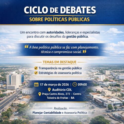 Teixeira de Freitas — Autoridades políticas, lideranças regionais e especialistas da área de gestão pública participarão, no próximo dia 17 de março de 2026, de um Ciclo de Debates sobre Políticas Públicas, promovido pela empresa Planejar Contabilidade e Assessoria Política. O encontro será realizado no centro de Teixeira de Freitas e tem como objetivo discutir os desafios e estratégias para o fortalecimento da administração pública na região.
