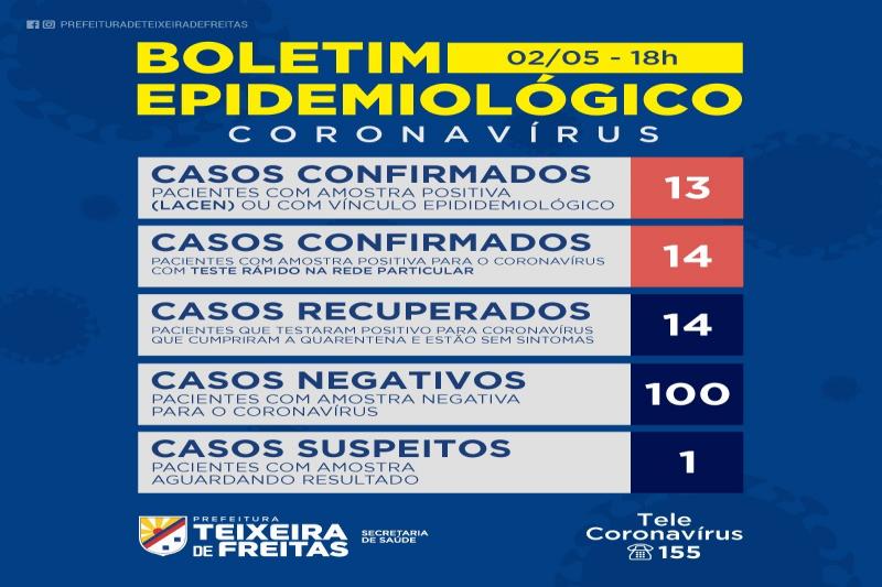 A Secretaria Municipal de Saúde informa que Teixeira de Freitas registra, em 02/05/2020, 27 casos positivos para COVID 19. São 2 novos casos confirmados em 02 de maio, um atestado pelo LACEN e um por Teste Rápido (TR) em laboratório privado do município. Nesta data, a Bahia registra 3315 casos confirmados e 123 óbitos.