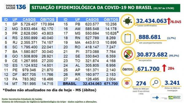 Com as novas informações, o total de pessoas infectadas pelo novo coronavírus durante a pandemia soma 32.434.063.