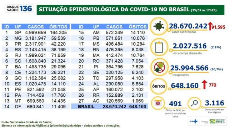 Covid-19: Brasil tem 28,6 milhões de casos e 648,1 mil mortes