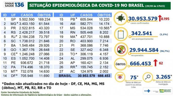 O Brasil registrou, em 24 horas, 8.195 casos e 62 mortes por covid-19 segundo o boletim epidemiológico divulgado pelo Ministério da Saúde. Desde o início da pandemia, foram registrados 30.953.579 casos e 666.453 mortes pela doença.