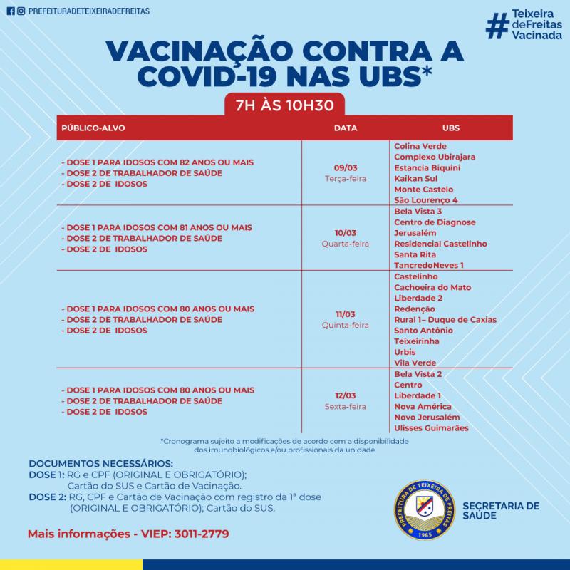 Cronograma de vacinação de 9 a 12 de março em Teixeira de Freitas