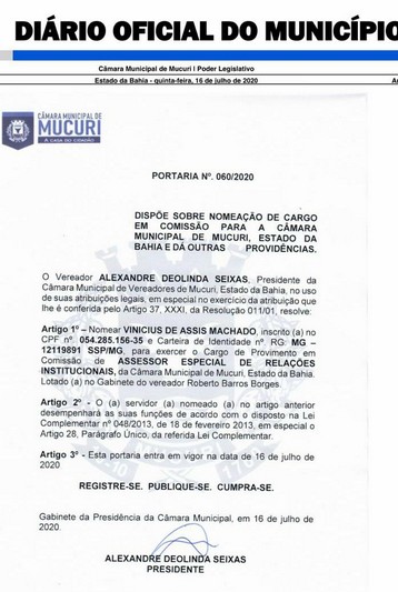 Portaria nº 060/2020, publicada na quinta-feira (16/07) no Diário Oficial do Poder Legislativo Municipal, confirma a nomeação de Vinicius de Assis Machado no cargo de Assessor Especial de Relações Institucionais da Câmara de Mucuri, lotado no gabinete do vereador Roberto Barros Borges, o Beto Borges, com salário nominal de R$ 2.174,93.