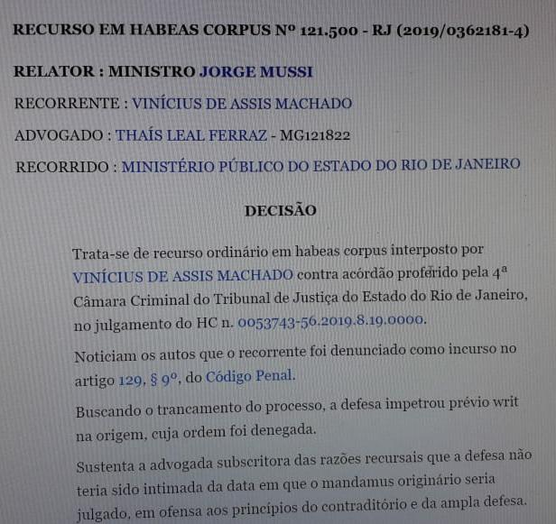 No site de consulta processual do Superior Tribunal de Justiça (STJ), Vinicius aparece como denunciado incurso no artigo 129, parágrafo 9º, do Código Penal – violência doméstica com lesão corporal, em processo movido pelo Ministério Público do Estado do Rio de Janeiro.