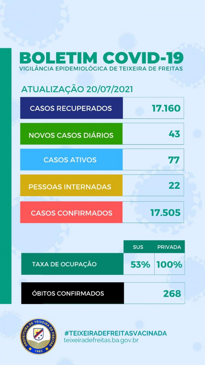 Nesta terça-feira, 20 de julho,  a Secretaria de Saúde de Teixeira de Freitas informou 43 novos casos positivados. Até o momento são 17.505 casos confirmados. Destes, 77 são considerados ativos, ou seja, as pessoas que ainda têm a possibilidade de transmitir o vírus. Até o momento são 268 mortes. A taxa de letalidade em Teixeira de Freitas é de 1,53% em relação aos casos confirmados. Nossa taxa de recuperação é de 98,02%, são 17.160 recuperados.