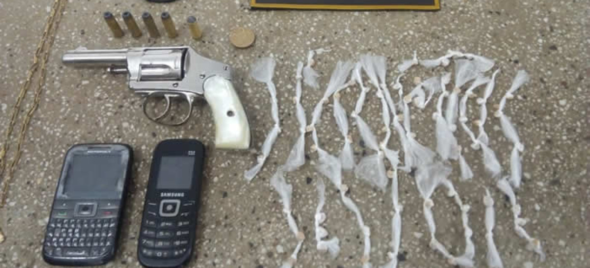 Com os acusados os policiais apreenderam um revólver calibre 32, de marca Ina, com três cartuchos deflagrados, e três picotados, uma garrucha de dois canos, de calibre 38, 30 buchas maconha, e vários embalagens plásticas usadas para acondicionar drogas.