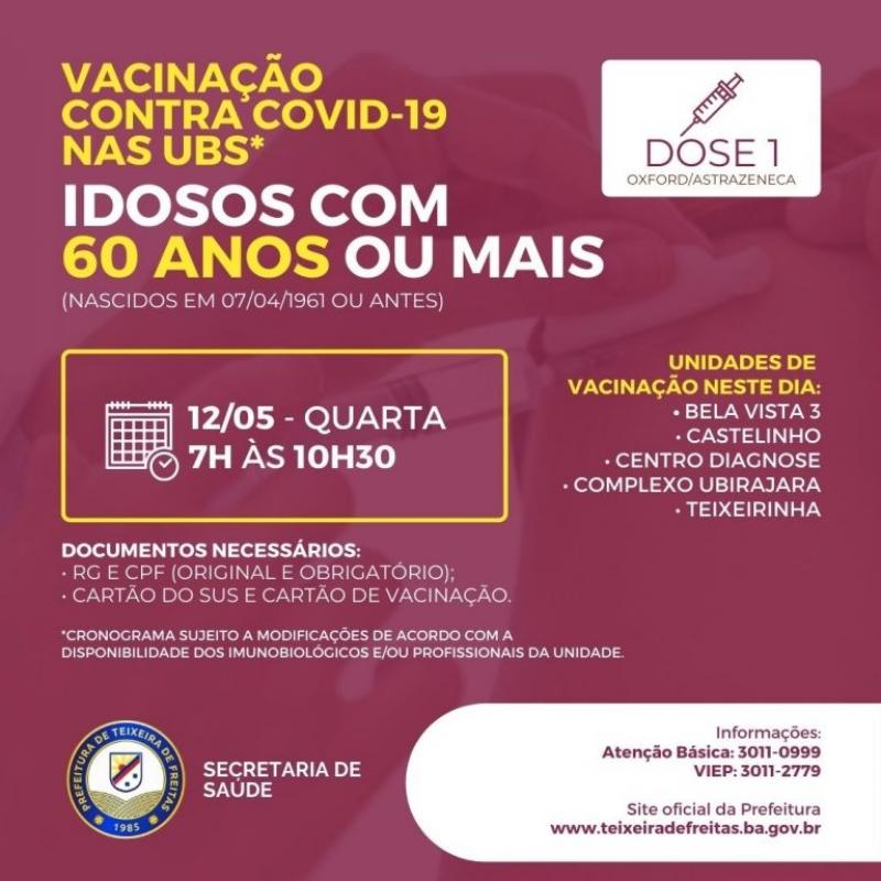 Para continuar a imunização dos idosos com mais de 60 anos, nesta quarta-feira (12), a Secretaria Municipal de Saúde irá vacinar nas Unidades Básicas de Saúde.
