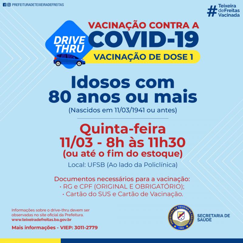 Na quinta-feira (11 de março), idosos de 80 anos ou mais poderão ser vacinados contra a Covid-19 em mais um drive-thru organizado pela Prefeitura Municipal. A ação será na UFSB, ao lado da Policlínica, das 8h às 11h30, ou até o fim do estoque. Essa é a vacinação de dose 1, direcionada aos idosos nascidos a partir de 11/03/1941, que ainda não estavam no grupo para o qual o imunizante foi disponibilizado, ou para aqueles que ainda não tiveram a oportunidade de tomar a vacina.