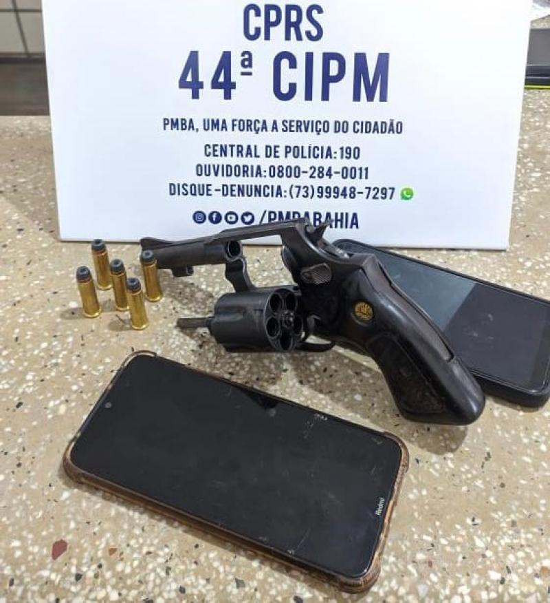 Em ato contínuo foi efetuada a busca pessoal, onde foi constatado que um dos indivíduos portava uma arma de fogo calibre .38, municiada com 5 munições intactas do mesmo calibre. Com os mesmos também foram apreendidos 01 motocicleta Honda CG 150 FAN; 01 Smartphone Samsung e 01 Smartphone Xiaomi Redmi.
