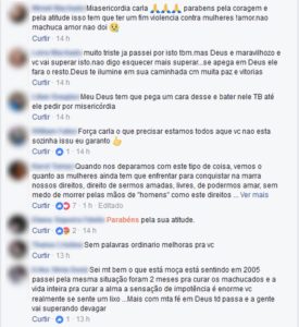 A publicação de Carla tem mais de 1,8 mil curtidas até esta quinta-feira (16), cerca de 100 compartilhamentos e comentários de amigos, familiares e até mesmo pessoas desconhecidas que se solidarizaram com a declaração da vítima.