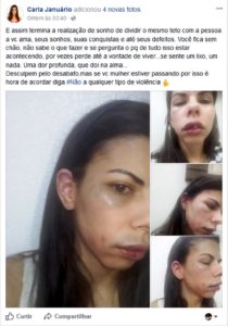 Para conscientizar outras mulheres a denunciarem este tipo de crime, Carla publicou na terça-feira (14), em seu perfil do Facebook, as fotos dos ferimentos mais recentes, o relato de um relacionamento abusivo e também denúnciou o caso à polícia.