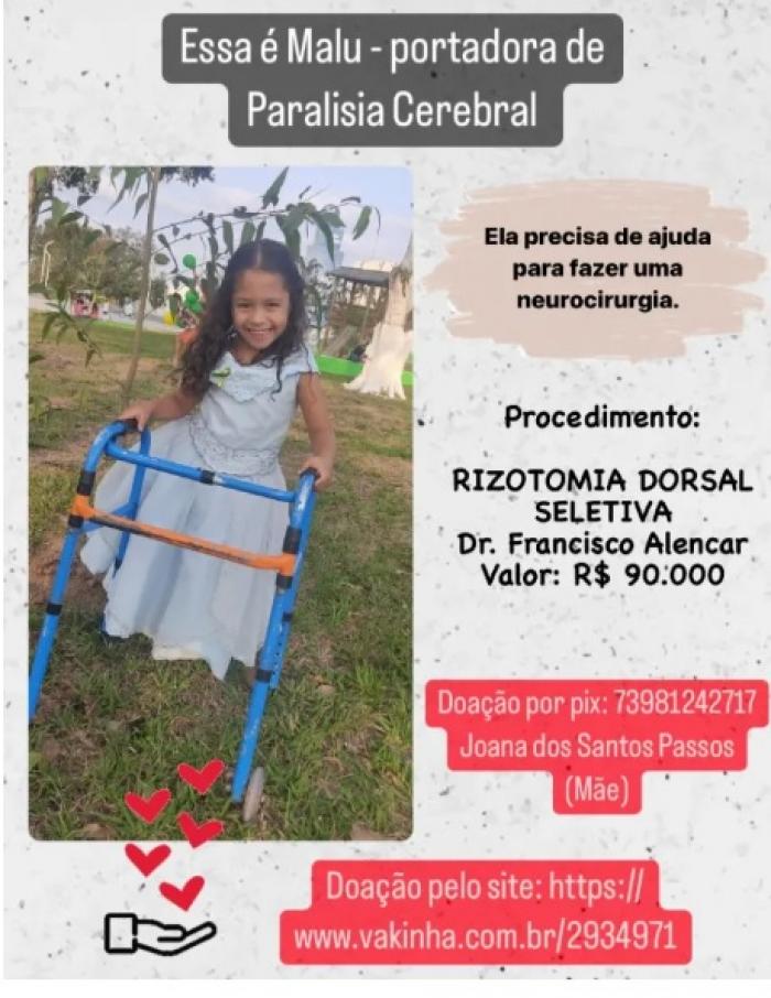 Malu passou por uma consulta no dia 21 de junho deste ano, com um neurocirurgião, que indicou a cirurgia de risotomia dorsal seletiva. O procedimento neurológico alcança o valor de R$ 90 mil e é realizada na cidade de Teresina (PI).