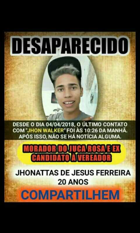 Jhonata de Jesus Ferreira, 20 anos, está desaparecido desde a manhã de quarta-feira, e apesar de uma intensa campanha de buscas e divulgação, até o momento não foi possível, se ter uma ideia do paradeiro do jovem, que também é repórter em um portal de noticias da região.