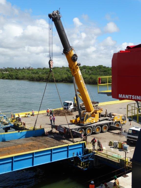 Fabricados na Finlândia, os guindastes de grande porte operam no carregamento das barcaças que transportam madeira, no Terminal de Caravelas, e no descarregamento das embarcações, em Barra do Riacho. Cada barcaça comporta uma carga equivalente a 100 viagens de caminhões tritrem, contribuindo para desafogar o tráfego nas rodovias.