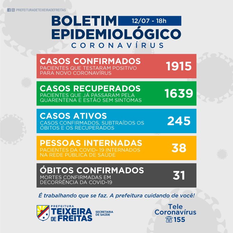 Nesta data, a Secretaria de Saúde de Teixeira de Freitas comunica, com pesar, mais uma morte em decorrência da COVID-19. Nos demais registros, não houve alteração nos dados epidemiológicos no município, exceto no quadro dos internados. Nosso município manteve o total de 1915 casos positivos, sendo que 245 são considerados ativos.