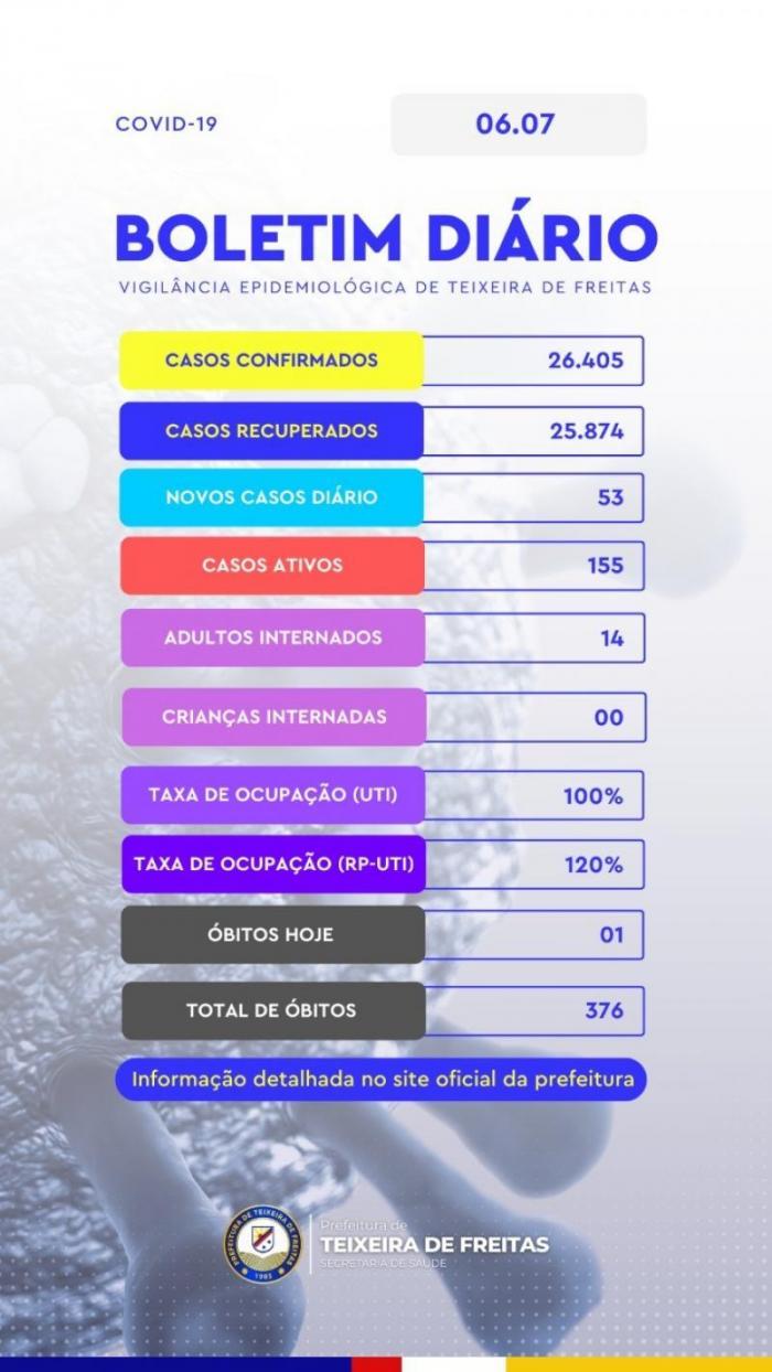 Nesta quarta-feira, a Secretaria de Saúde de Teixeira de Freitas informou que há 53 novos casos positivados. Até o momento são 26.405 casos confirmados. Destes, 155 são considerados ativos, ou seja, as pessoas que ainda têm a possibilidade de transmitir o vírus. Já foram contabilizadas 376 mortes. Ao total são 25.874 recuperados.