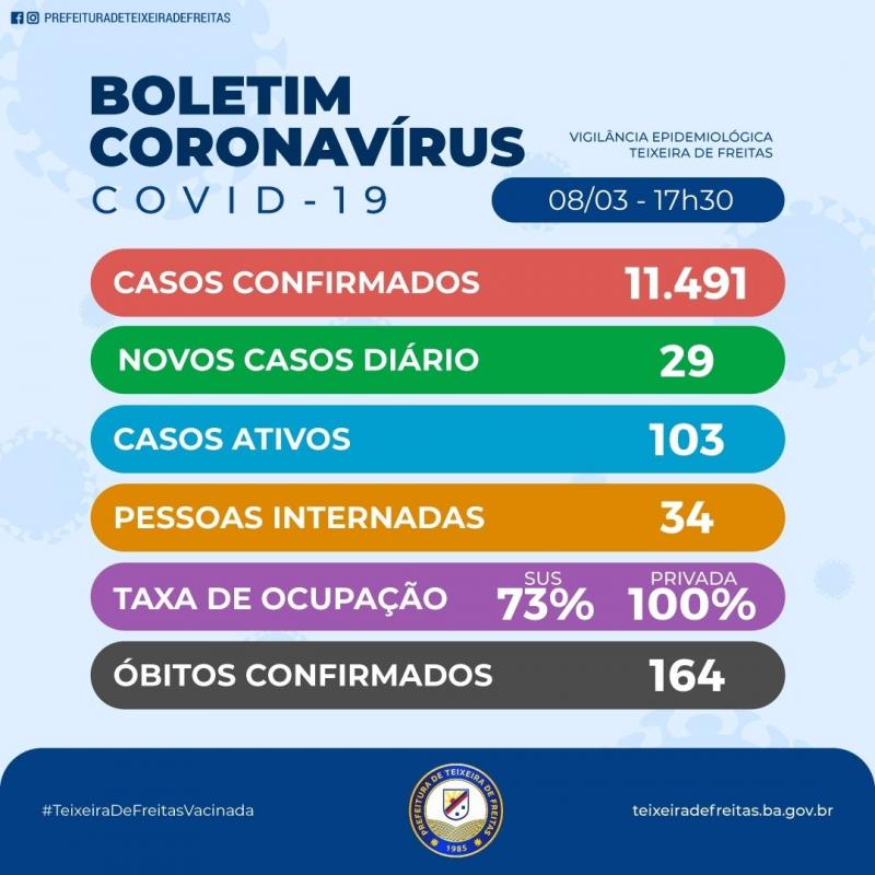 Na segunda-feira, 08 de março, a Secretaria de Saúde de Teixeira de Freitas informou que houve registro de 29 novos casos positivados. Até o momento são 11.491 casos confirmados. Destes, 103 são considerados ativos. Até o momento são 164 mortes. A taxa de letalidade em Teixeira de Freitas é de 1,44%, em relação aos casos confirmados.