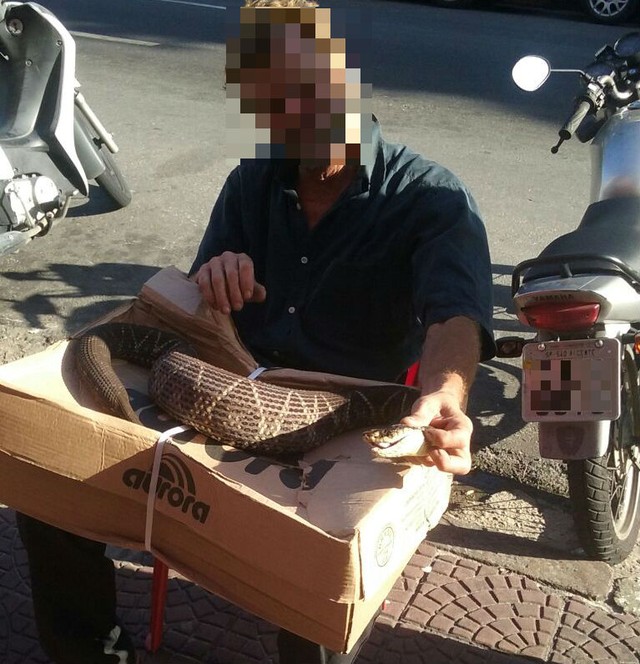 o ambulante foi picado poucos momentos depois na altura das mãos. Com dor, ele abandonou o animal na praça, o que causou pânico entre quem passava pelo local. A Guarda Municipal foi acionada e recolheu a cobra para ser encaminhada ao Centro de Pesquisa e Triagem de Animais Selvagens (Ceptas), em Cubatão.