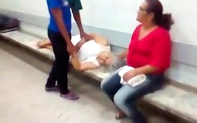 O vídeo, gravado na semana passada pelos familiares da idosa Creuza Maria da Silva Faustino, foi divulgado nas redes sociais. Nas imagens, a mulher aparece deitada em um banco do hospital. Os parentes disseram que ela estava com a pressão alta.
