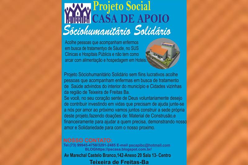 A Igreja Batista Central abre as portas na sexta-feira, 23 de março, para mais um projeto social em Teixeira de Freitas. A Casa de Apoio (PSCAPS) é uma iniciativa social filantrópica sem fins lucrativos e conta com o apoio de voluntários, autoridades, juízes e empresários da cidade.
