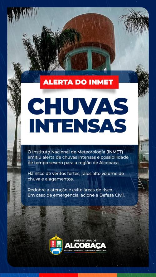 A região de Alcobaça e cidades vizinhas devem enfrentar um período de instabilidade climática entre os dias 2 e 5 de março. O Instituto Nacional de Meteorologia (INMET) emitiu alerta para chuvas intensas, com possibilidade de tempo severo.