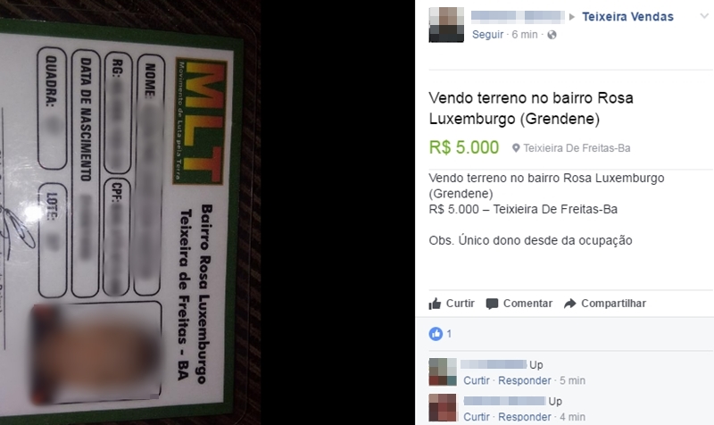 Um integrante do Movimento Luta por Teto (MLT) anunciou na terça-feira, 2 de maio, à venda em um grupo do Facebook, um dos terrenos ocupados na área da Grendene, o atual “Rosa Luxemburgo” em Teixeira de Freitas.