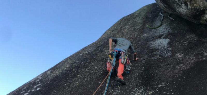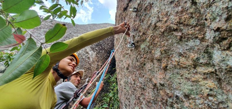 Compondo o grupo ao lado do marido Rafael Vendramini, Mila Lopes Baia, realizou a proeza de ser a primeira mulher a chegar ao cume do Monte Pescoço, uma das formações rochosas mais icônicas da Costa das Baleias.